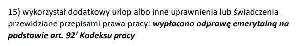 Poniżej przykład zapisu o odprawie emerytalnej w ust.6 pkt 15 świadectwa pracy: