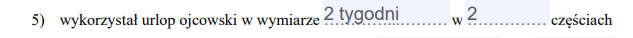 Poniżej przykład zapisu w świadectwie pracy wykorzystanego przez pracownika urlopu ojcowskiego w wymiarze 2 tygodni w 2 częściach.