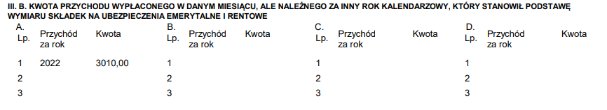 III.B. Kwota przychodu wypłaconego w danym miesiącu, ale należnego za inny rok kalendarzowy, który stanowił podstawę wymiaru składek na ubezpieczenia emerytalne i rentowe.